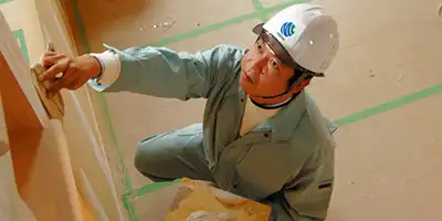 木下工務店の半世紀を超える歴史は、家づくりの匠であるマイスターたちと共にあります。2×4工法を早くから導入した当社では、技能者が不足していた時代から「木下工務店高等職業訓練校」を運営し、優秀な職人の育成に力をそそいでいました。人を育て、技を育む。そして、それぞれの優れた技術が「キノシタ マイスタークラブ」という組織によって集結し、協力しあって、より良い家づくりに取り組んでいます。